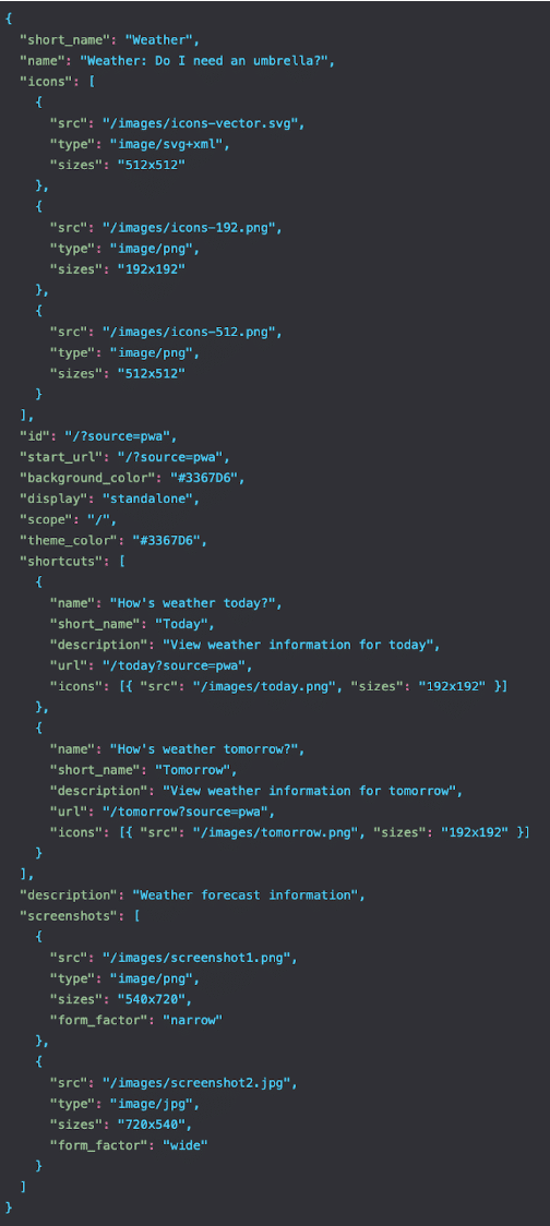 Another thing specific to PWAs is their manifest.json file that practically tells the browser about your Progressive Web App and how it should behave when installed on the user’s desktop or mobile device. A typical manifest file includes the app name, the icons the app should use, and the URL that should be opened when the app is launched, among other things. Think of this manifest as a sort of android app manifest or an ios info.plist file