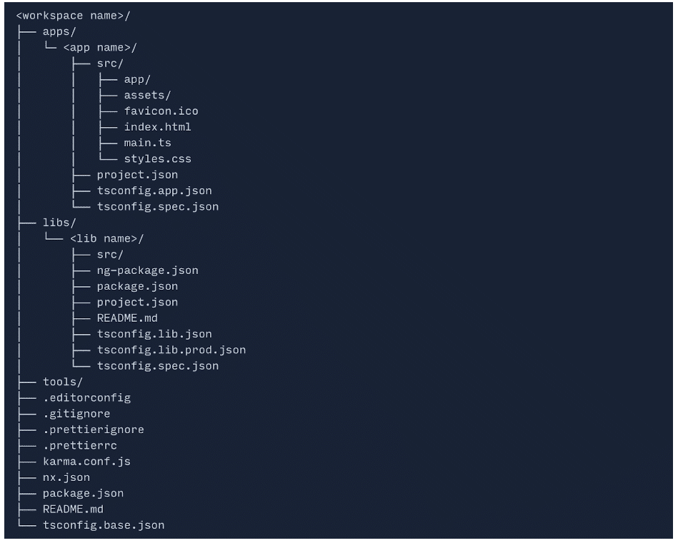 The second type of workspace is the nx workspace, which is characterized by the fact that the application’s structure is completely different from what you are used to with the usual CLI. This is because the Nx application structure focuses on a monorepo approach for creating multiple apps that consume functionality from multiple library modules.
