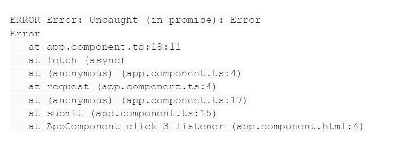 As you can tell, there is only 1 line that corresponds to some angular functionality. The other lines are pretty much from other libraries that Angular uses, such as Zone.js or RxJs.