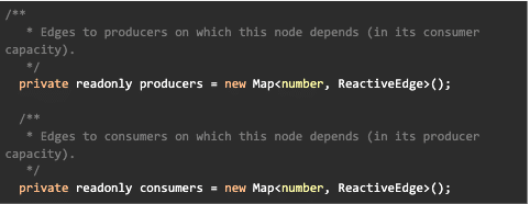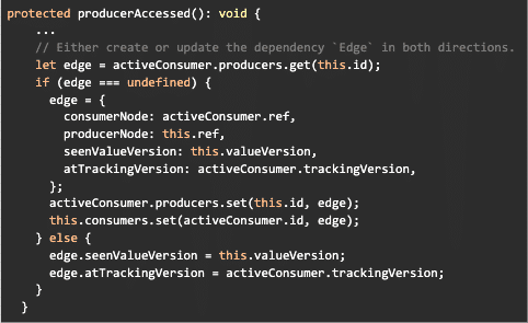 Updating the producers and consumers is done through the method producerAccessed part of ReactiveNode . You can see that there’s also trackingVersions and valueVersions which are used to determine if the edge in the graph is stale or not.