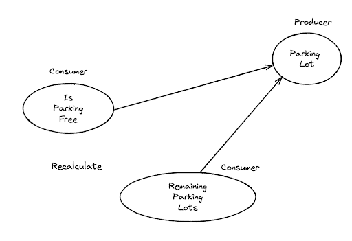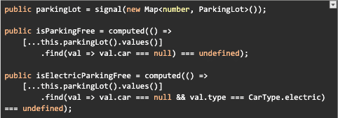 Let’s say we have a signal called parkingLot and another two computed signals isParkingFree and isElectricParkingFree.