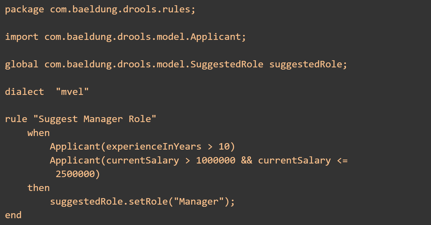 In this example, we’ve used a few Drools provided keywords. Let’s understand their use:
